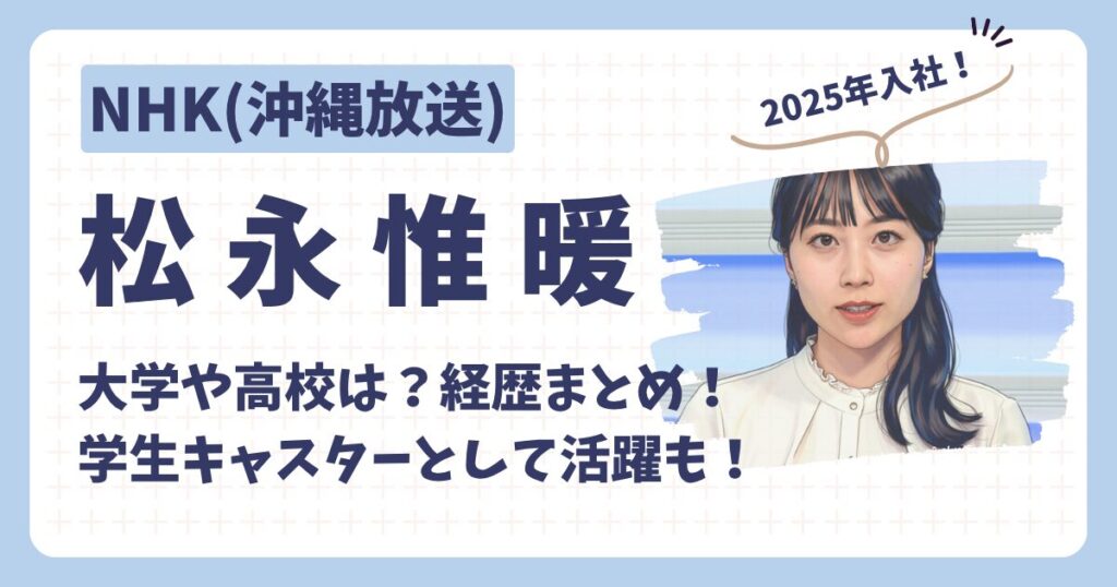 2025年春にNHKへ入局し、沖縄放送局で注目を集めている新人アナウンサー「松永惟暖(まつなが ゆのん)」アナ。 柔らかい雰囲気と落ち着いた話し方で、すでに「癒やし系アナ」としてファンが増えています。 この記事では、松永惟暖アナの「高校・大学・経... -